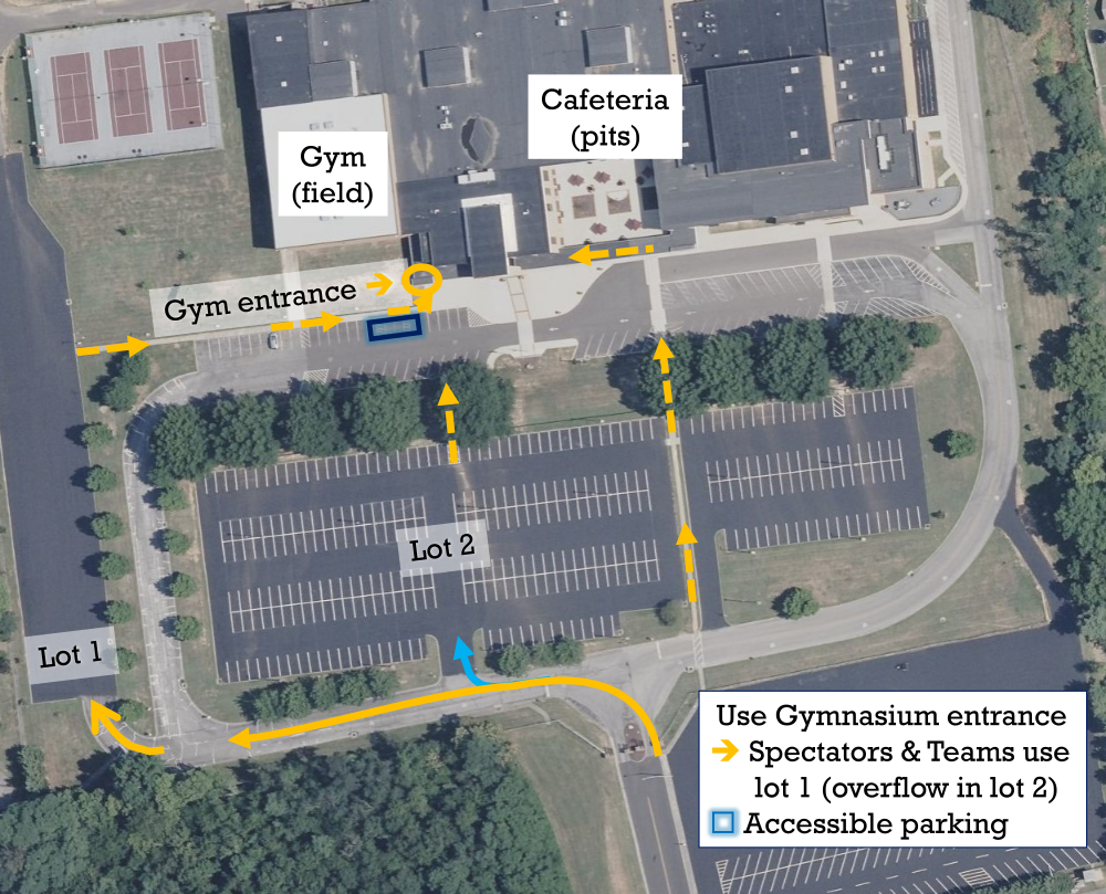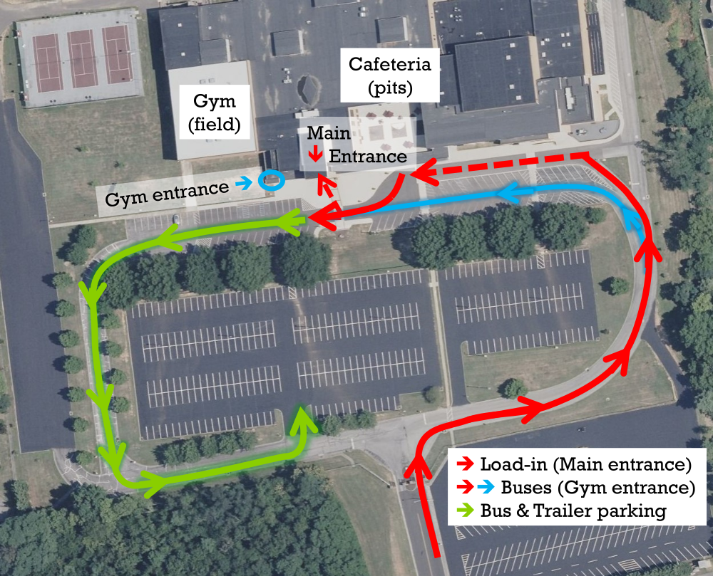 Optional early team load-in will begin at 5:00 PM Friday. Regular team load-in will begin Saturday at 7:15 AM. Below is the load-in and parking map. Teams will load-in at the drop-off area in front of the school. Please use the main entrance for load-in, and use the gym entrance otherwise.